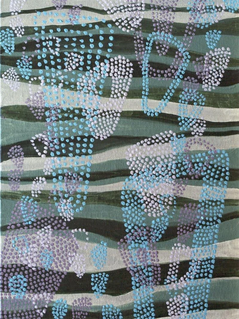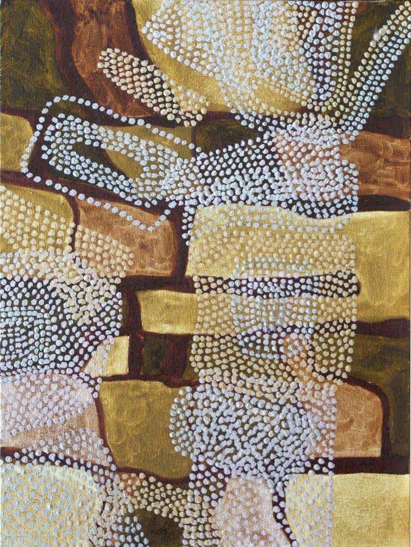 Traveling in Australia, I spent a few days in Darwin. That was my jumping off point for a dusty road trip east to Kakadu National Park, the heart of Aboriginal culture. I viewed Aboriginal art in contemporary galleries in town and in ancient rock and cave paintings at Kakadu. Both the ancient and the modern work incorporate dots, circles and various other geometric shapes. I was told that Aboriginal artists paint with the intention of mapping the geophysical environment concretely as viewed through the Aboriginal cosmology. But to the Western mind the objects in Aboriginal cartography don’t relate to physical reality; actual locations of places and landmarks in relationship to each other seem to be irrelevant. Frequently dreams are used for inspiration. Geometric shapes and their relationships in the paintings are symbolic. For example, dots and circles reference water. The various shapes relate to rocks, hills, trees, ponds, etc. but they are spatially organized in a way that is undecipherable to the western concept of mapping.