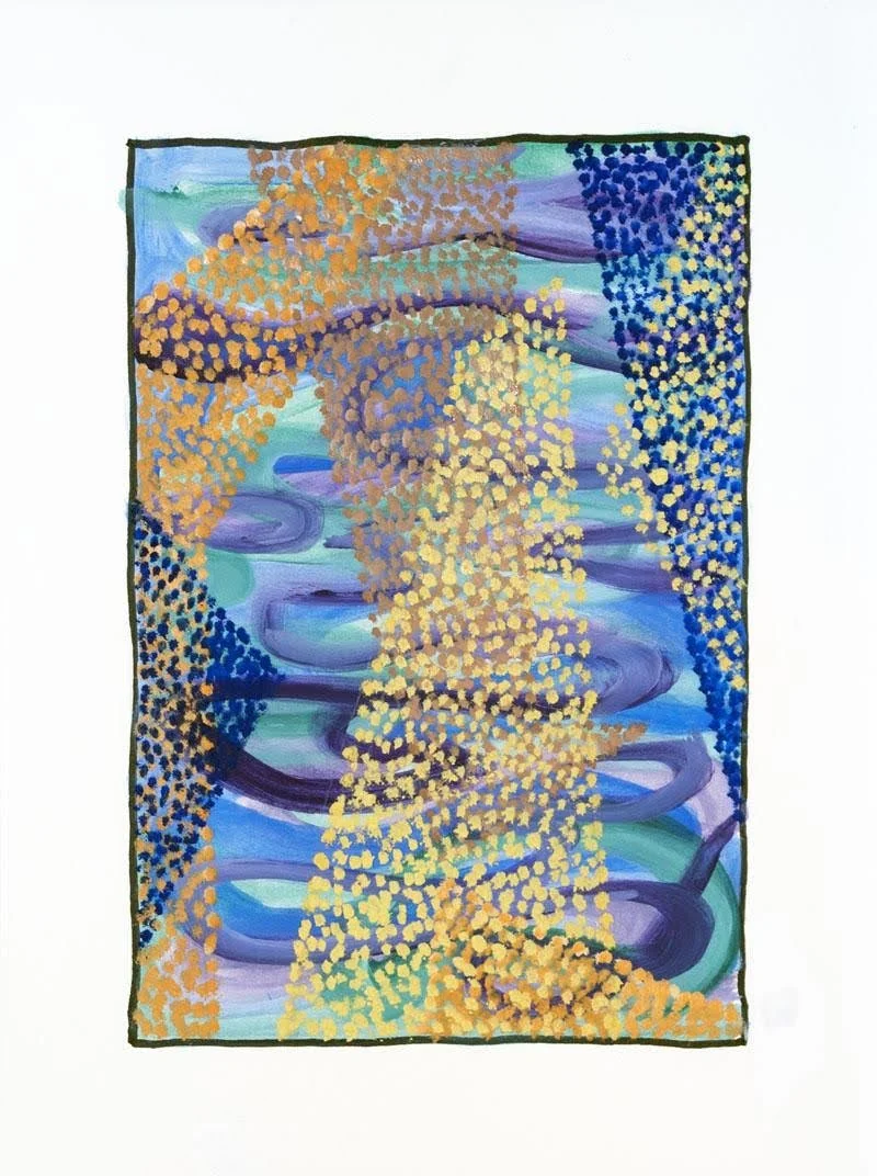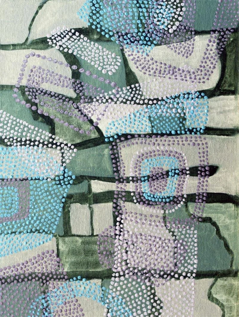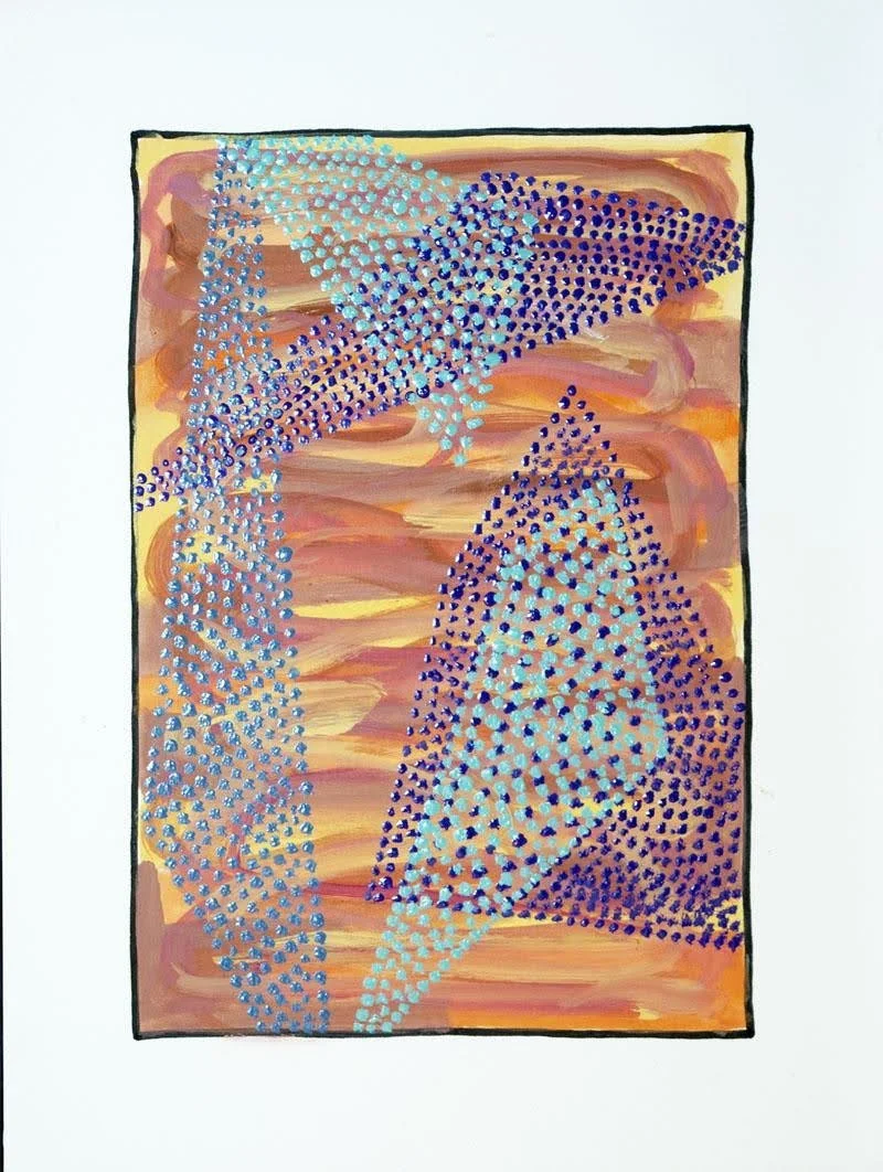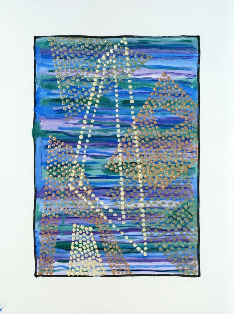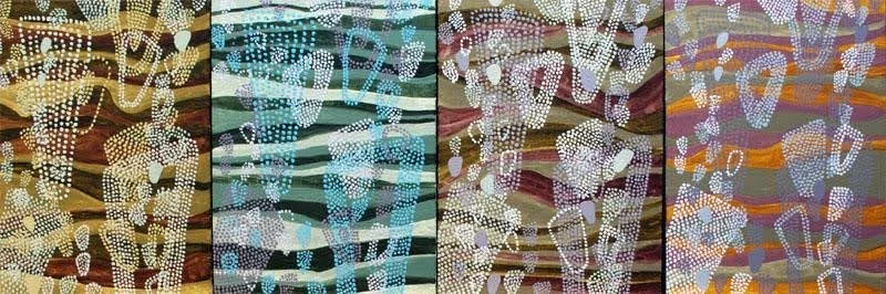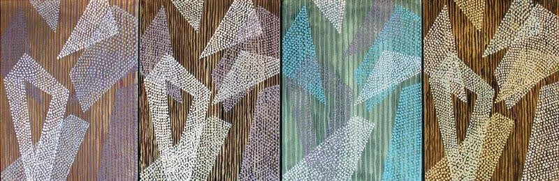 Consequently, my experiments with dots and geometric shapes might only accidentally capture any Aboriginal meaning. These paintings are merely experiments in abstraction with no concrete references whatsoever. The Quartets all contain the same design elements but differ in color. The trios all use the same colors but differ in design.