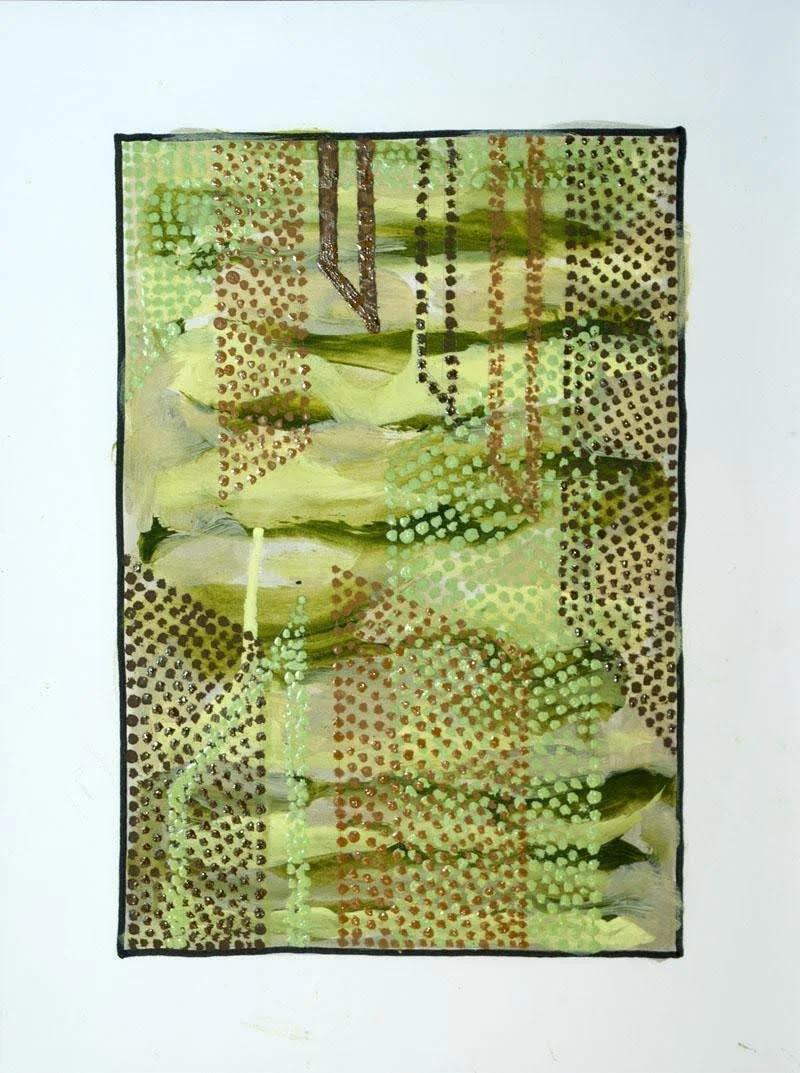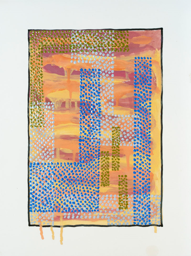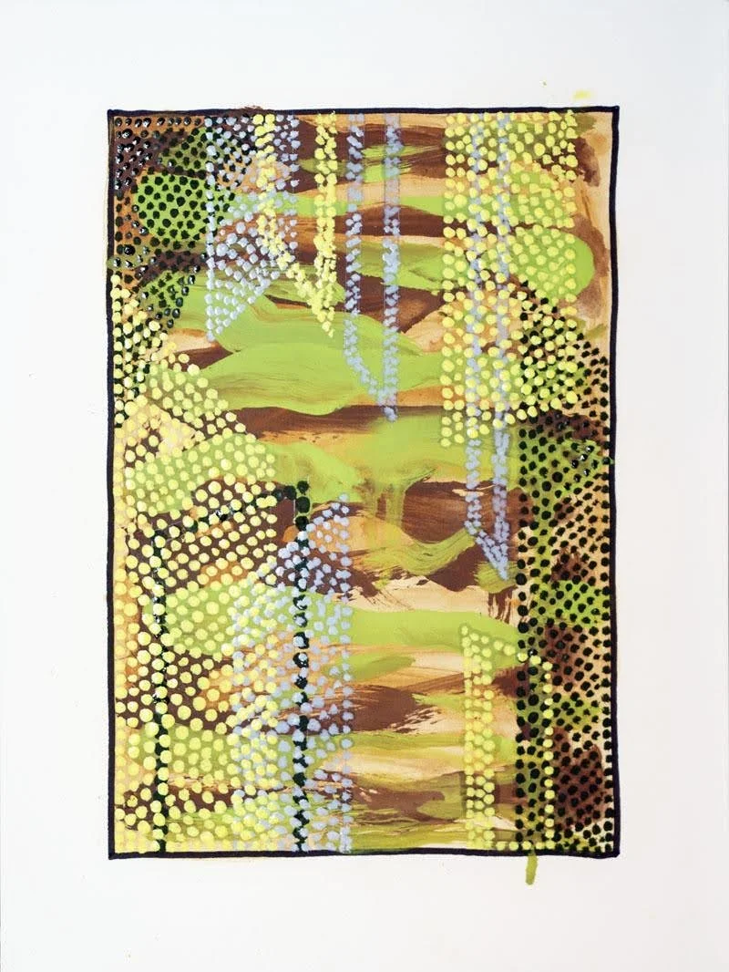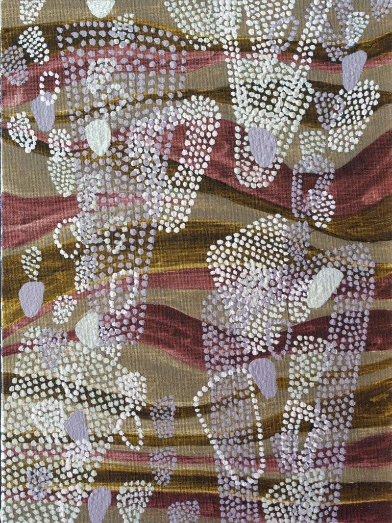 Consequently, my experiments with dots and geometric shapes might only accidentally capture any Aboriginal meaning. These paintings are merely experiments in abstraction with no concrete references whatsoever. The Quartets all contain the same design elements but differ in color. The trios all use the same colors but differ in design.